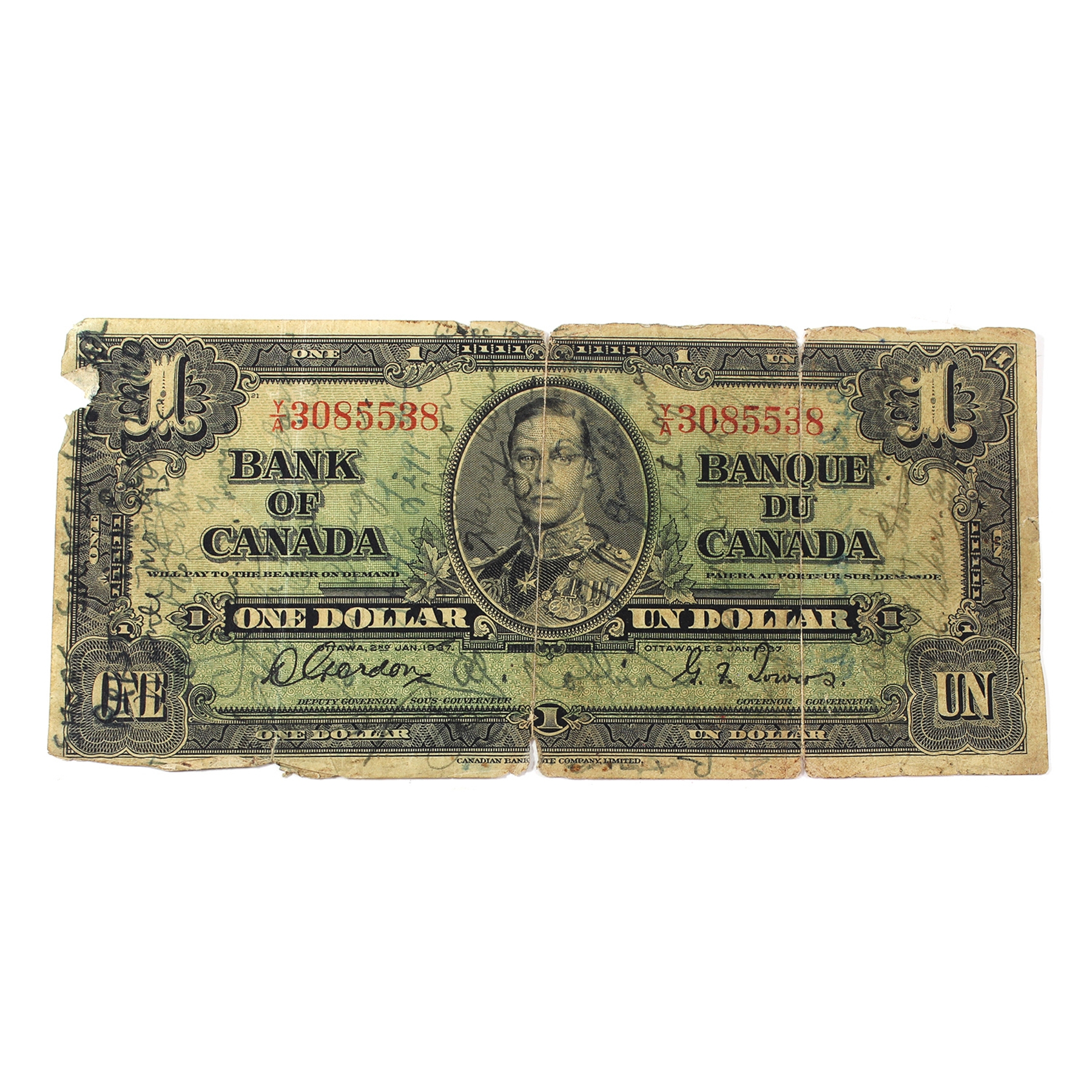 You are bidding on the front side of a 1937 "Short Snorter" $1 note. So the story goes, Short Snorter notes are signed by everyone in an army unit. Given the era of the piece, this was most likely a unit from the second world war. This particular piece in only the front side, for the back and front of this note, as can happen with 1937 issued notes, have been separated. The note is in well worn condition, which is usually the case with short snorters for, theoretically, they were kept on someone's person at all times. A very interesting piece of history.