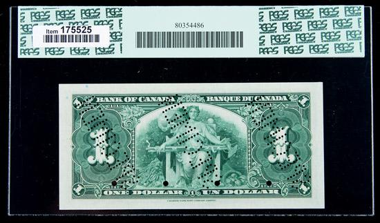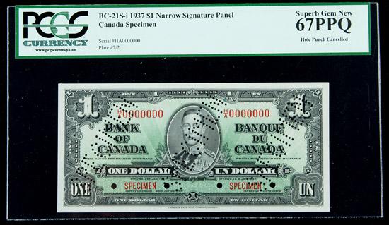 BC-21S-i 1937 $1. Narrow Signature Panel Specimen. PCGS Superb Gem New 67PPQ. Hole Punch Cancelled. From the Bank of Canada auction in November, 1999.