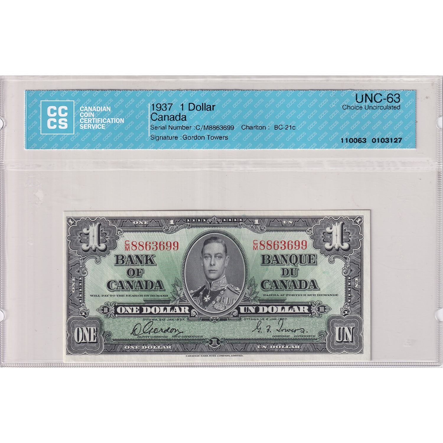 BC-21c 1937 $1 CCCS CUNC64 Gordon-Towers, SN: C/M8863699