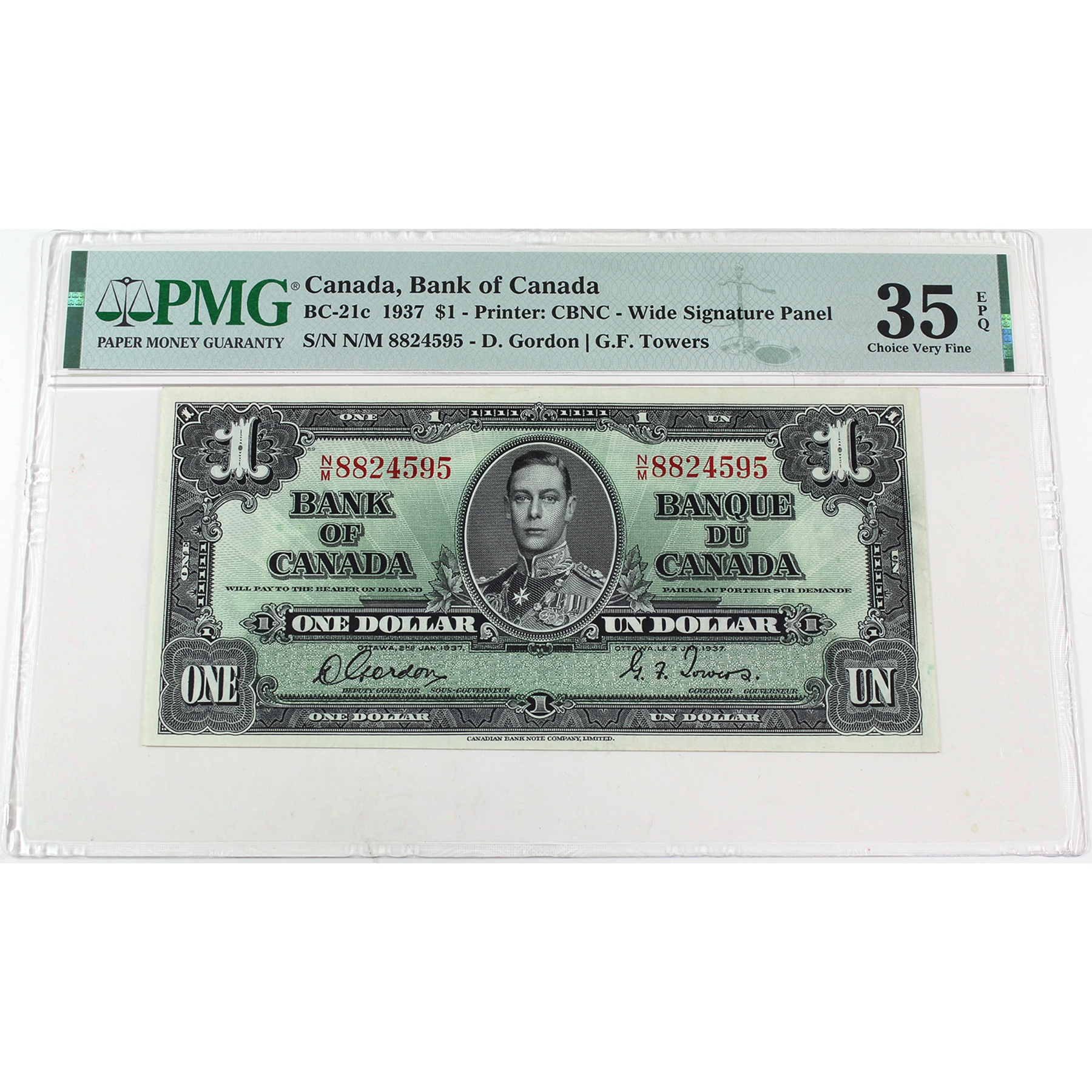BC-21c 1937 $1 PMG Choice VF35 EPQ Gordon-Towers Wide Signature Panel SN: N/M8824595