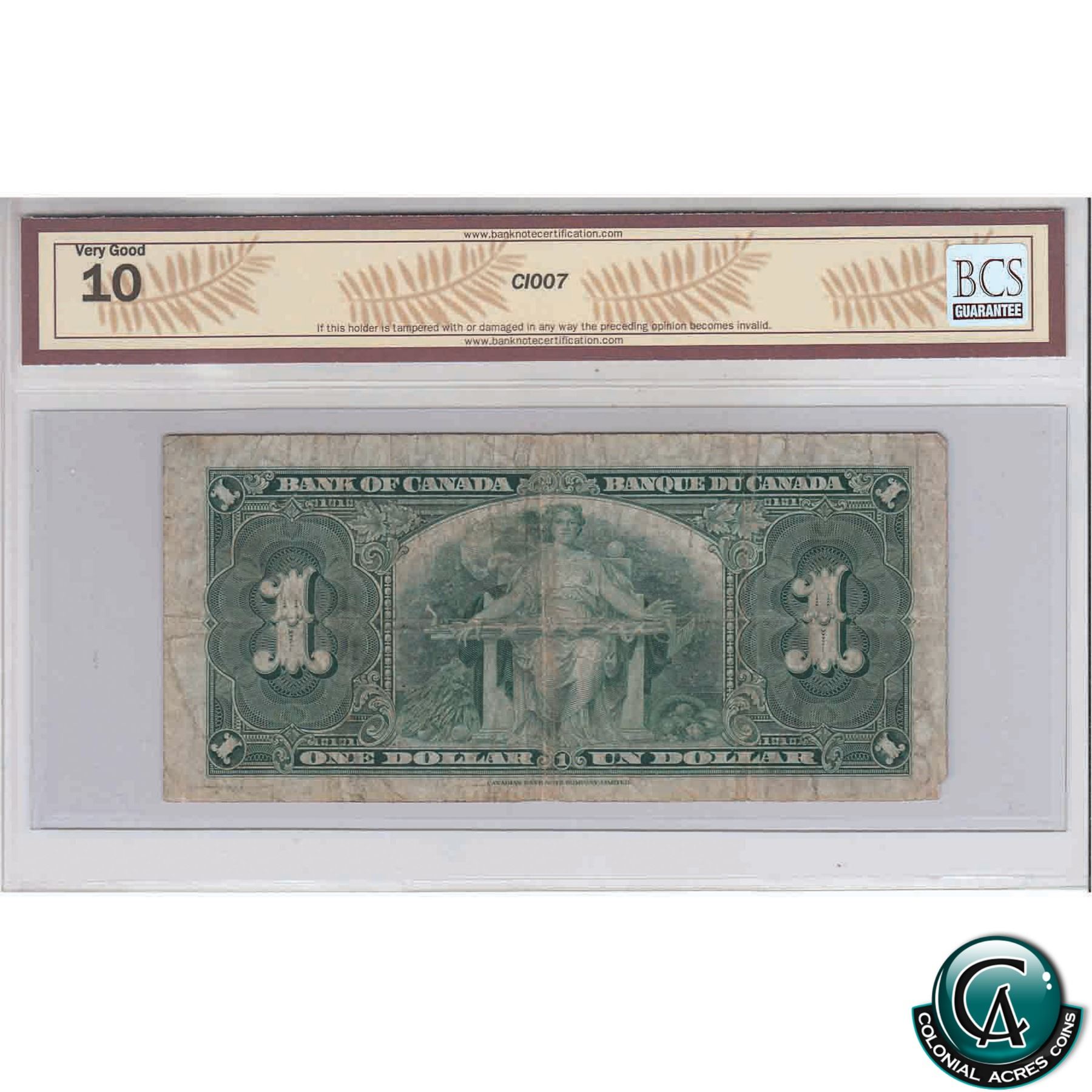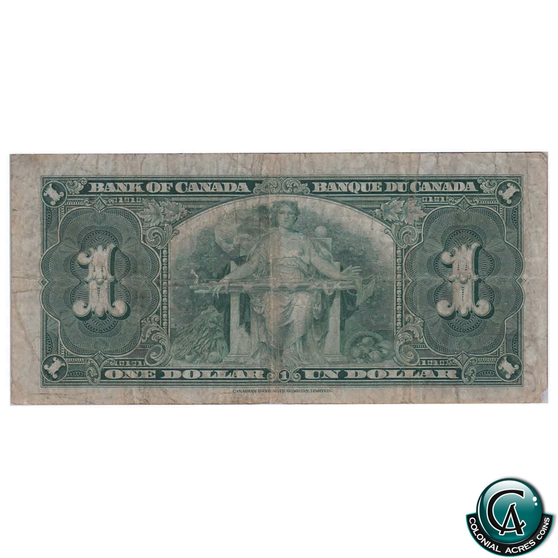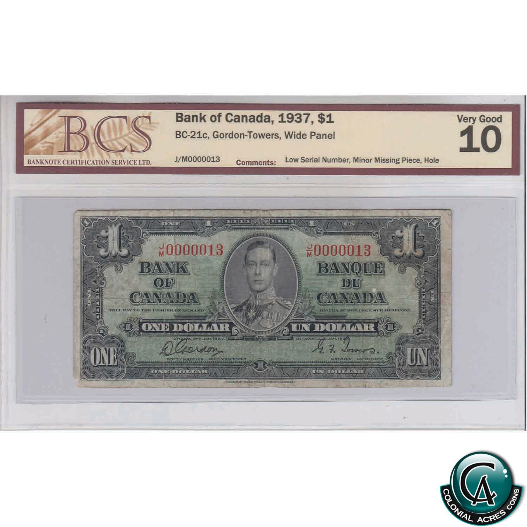 BC-21c 1937 Bank of Canada $1, Gordon-Towers, Wide Panel, JM 00000013, Low Serial Number, BCS VG-10 (minor missing piece, hole)