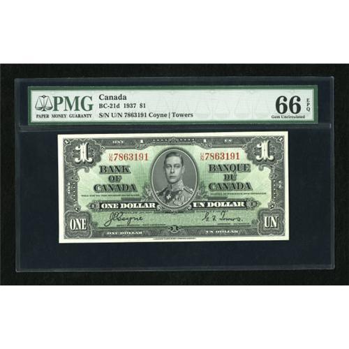<B>BC-21d $1 1937</B></I><BR> The margins are huge and the color impeccable on this Coyne/Towers graded <B>PMG Gem Uncirculated 66 EPQ.</B></I><BR><BR><b>Shipping:</b> Coins & Currency (<a target="_blank" href="http://www.heritageauctions.com/common/shipping.php">view shipping information</a>)<BR><BR><B>Imp