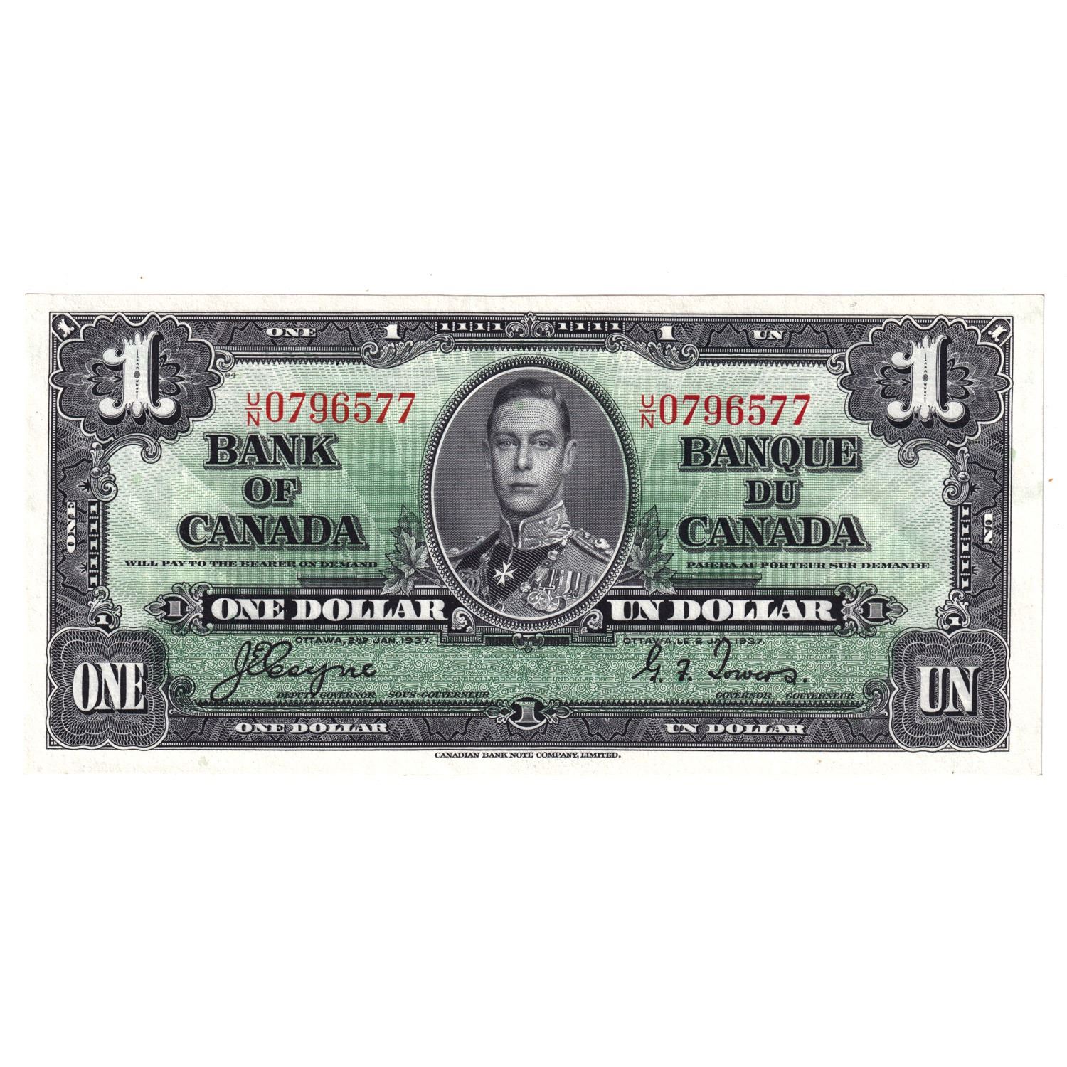 BC-21d 1937 Bank of Canada $1, Coyne-Towers. S/N: U/N0796577 AU-UNC Condition.
