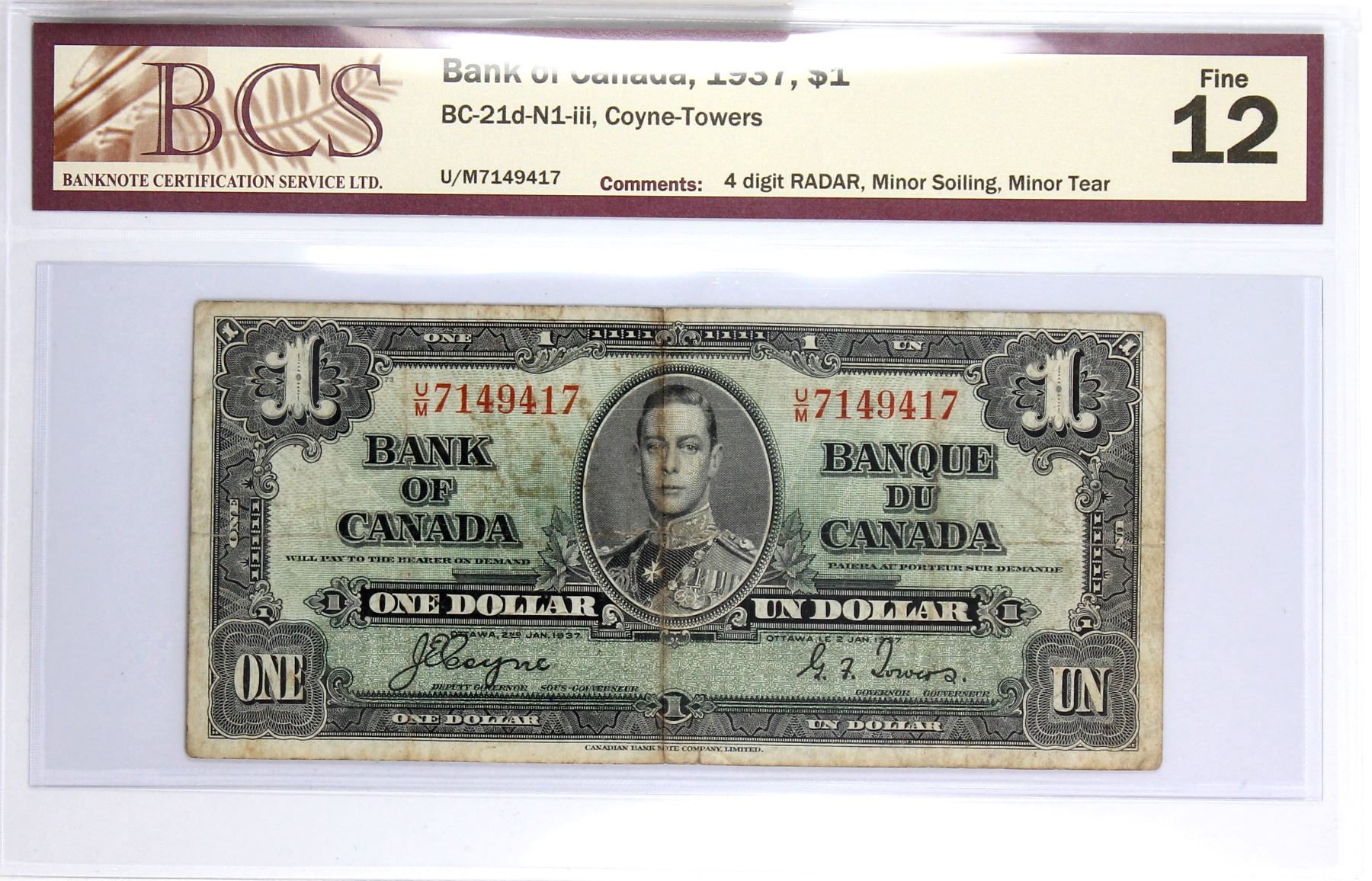 BC-21d-N1-iii 1937 Bank of Canada 4 Digit Radar $1, Coyne-Towers S/N: U/M7149417. BCS Certified F-12 (minor soiling, minor tear)