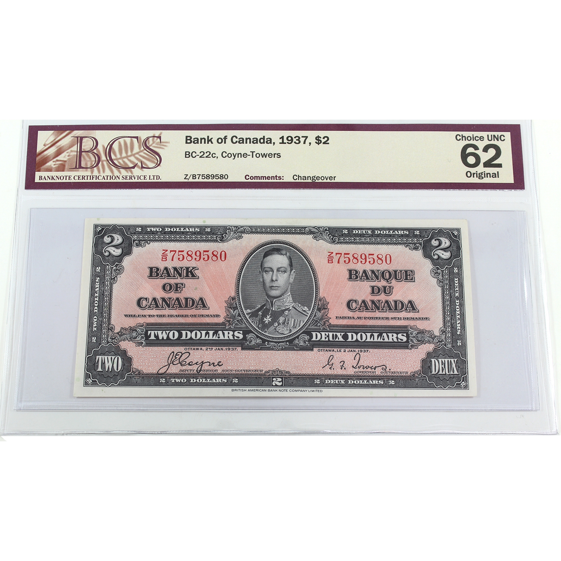 BC-22c 1937 $2 BCS CUNC62 Original Coyne-Towers Changeover SN: Z/B7589580