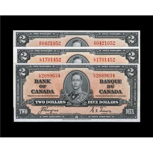 <B>BC-22c $2 1937. Three Examples.</B></I><BR>A better L/R prefix note is included in this lot that also has one note with a lightly printed back. <B>Choice Crisp Uncirculated.</B></I><BR><I>From The Halton Lake Collection</B></I>