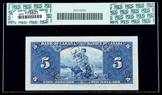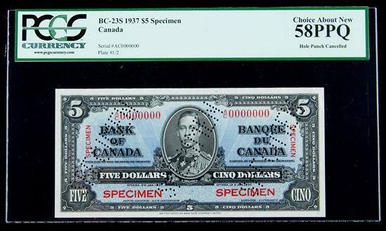 BC-23S 1937 $5. Specimen. PCGS Choice About New 58PPQ. Hole Punch Cancelled. From the Bank of Canada auction in November, 1999.