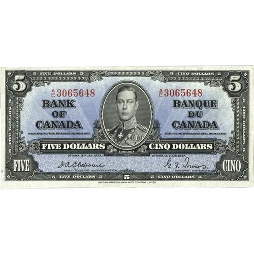 <B>BC-23a $5 1937</B></I><BR>The Osborne-Towers 1937 $5 note is a very scarce item, especially in the upper grades. This piece is the nicest the owner of the Halton Lakes collection could obtain. <B>About Uncirculated.</B></I><BR><I>From The Halton Lake Collection</B></I>