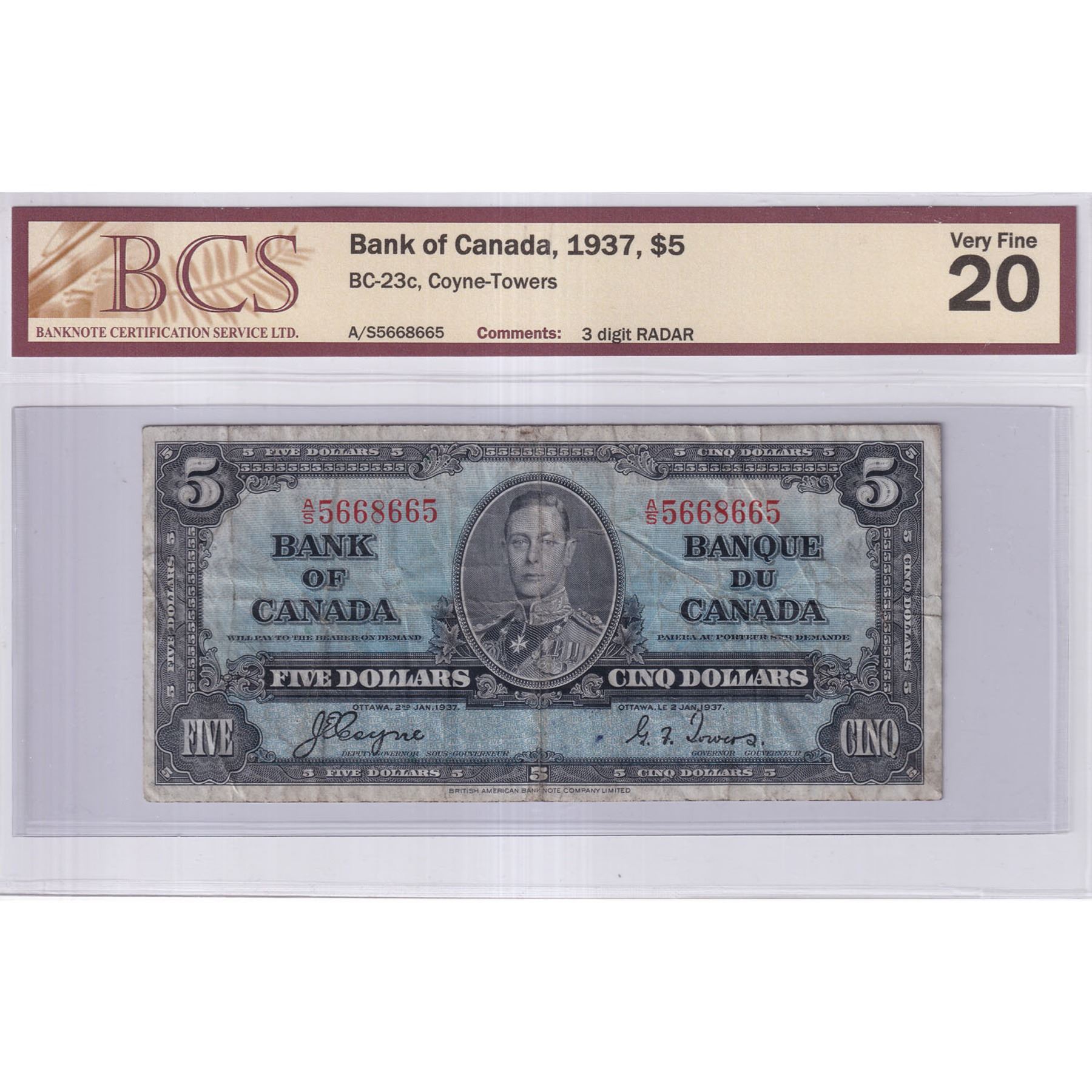 BC-23c 1937 Bank of Canada 3 Digit RADAR $5, Coyne-Towers S/N: A/S5668665 BCS Certified VF-20