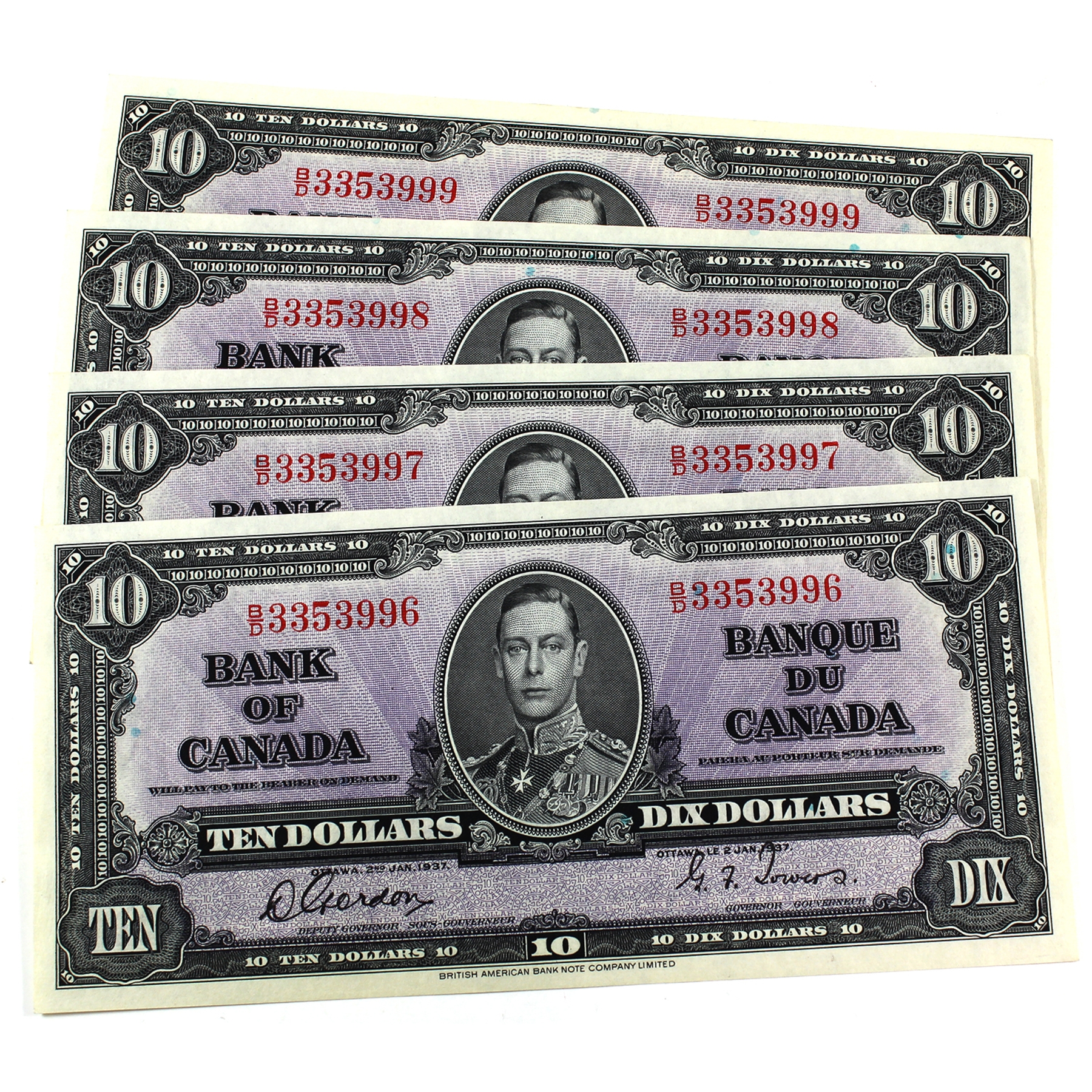 BC-24b 1937 $10 Consecutive UNC or better, Gordon-Towers SN: B/D3353996 to 999. 4pcs