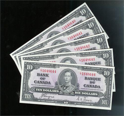 BC-24c 1937 $10 Coyne-Towers A nice run of five consecutive numbered notes. All notes are uncirculated.