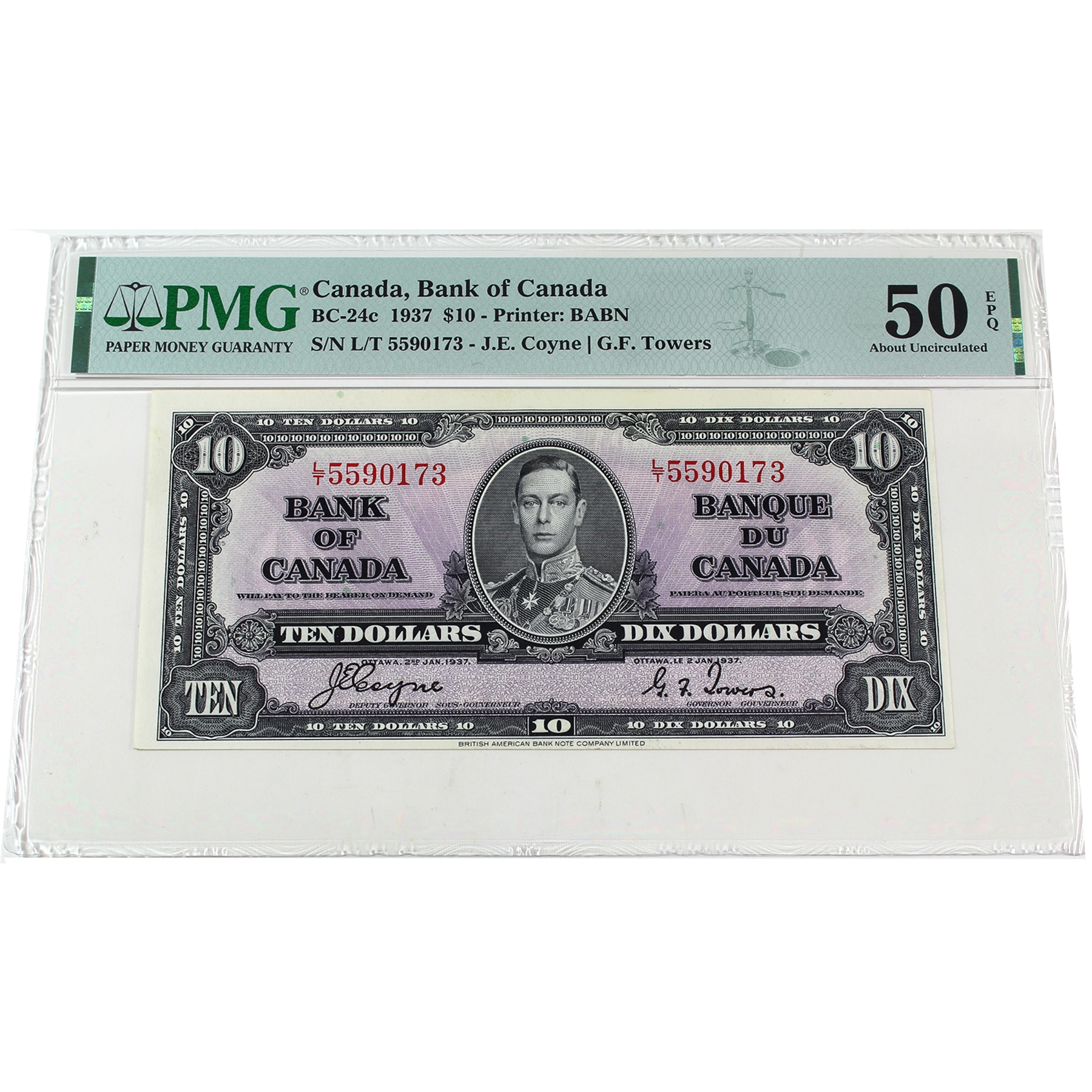 BC-24c 1937 $10 PMG AU50 EPQ Coyne-Towers SN: L/T5590173