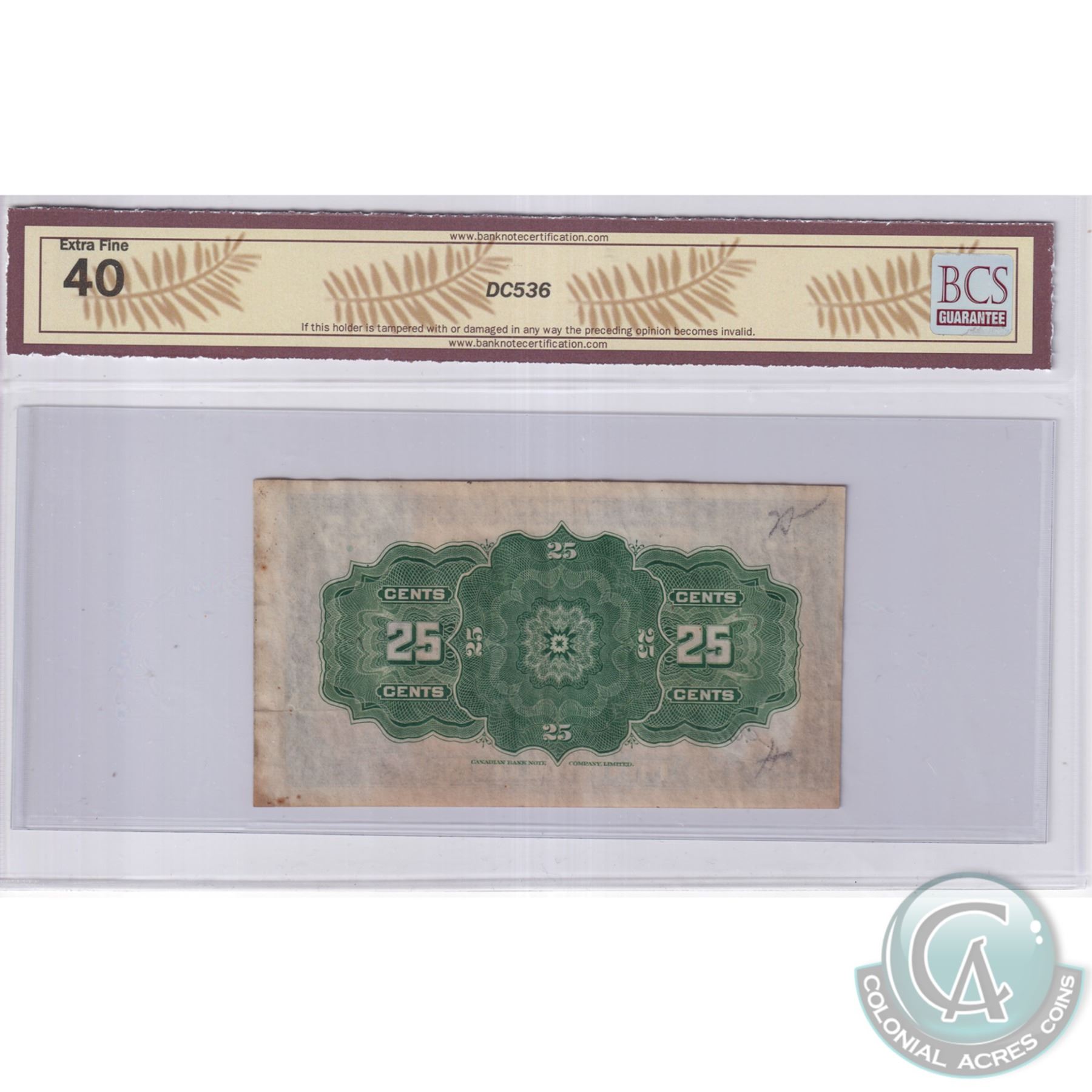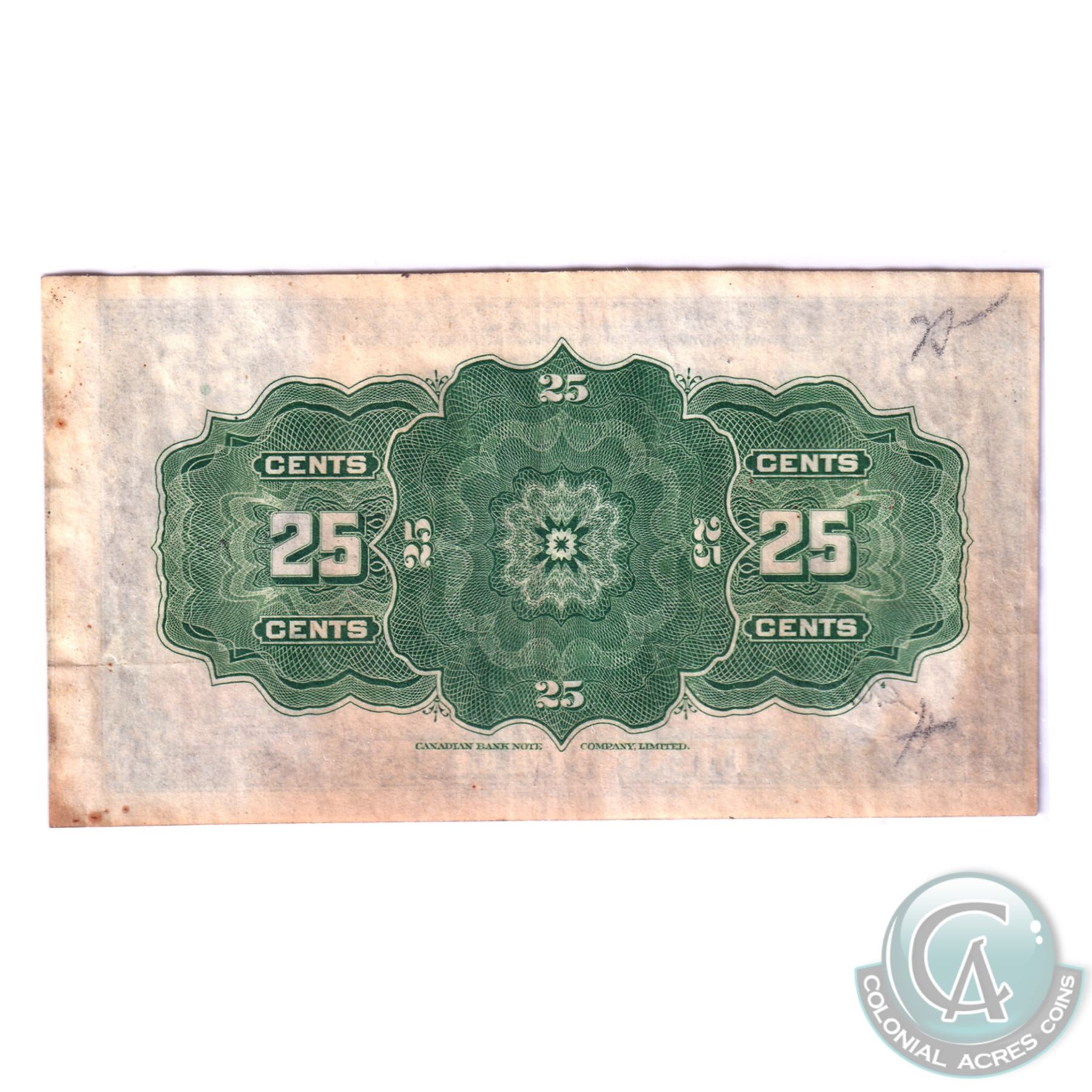BC-24c-E25a-i 1923 Dominion of Canada 25c, McCavour-Saunders, Check Letter A, S/N: 398289, Cut Off Size, BCS Certified EF-40 (writing, stains). Contains the side partial note in the original uncut sheet.