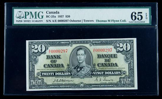 BC-25a 1937 $20. PMG Gem Uncirculated 65EPQ. This Osborne-Towers signature combination note is very scarce in high grades. This note was previously from the Tom Flynn collection.