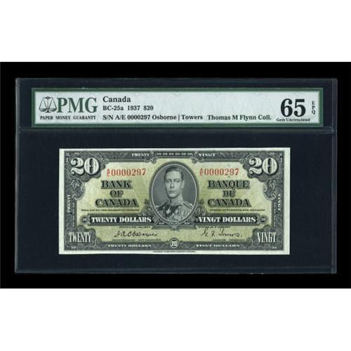 <B>BC-25a $20 1937</B></I><BR> A lovely example of this scarce note, with great eye appeal and loads of evident originality. It bears low serial number 0000297 as a bonus as well. PMG <B>Gem Uncirculated 65 EPQ.</B></I><BR><I>From The Thomas M. Flynn Collection</B></I><BR><BR><b>Shipping:</b> Coins & Currency (<a target="_blank" href="http://www.heritageauctions.com/common/shipping.php">view shipping information</a>)