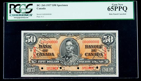 BC-26S 1937 $50. Specimen. PCGS Gem New 65PPQ. Hole Punch Cancelled. From the Bank of Canada auction in November, 1999.