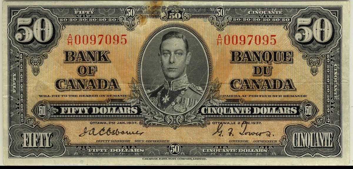 BC-26a 1937 $50 Osborne #0097095 VF tear. A nice looking note with small tear and stain. Still decent