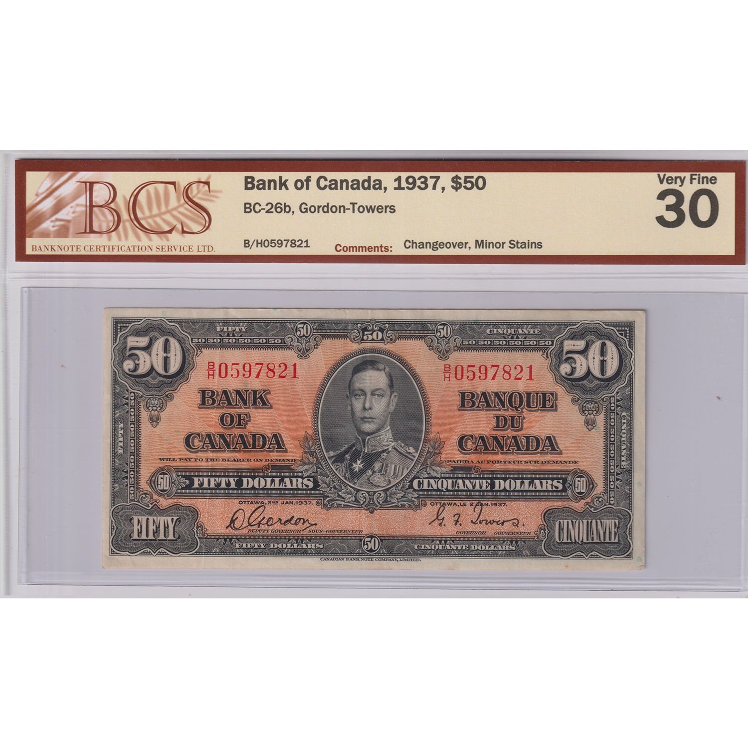 BC-26b 1937 Canada $50, Gordon-Towers, Changeover, B/H0597821, BCS Certified VF-30.