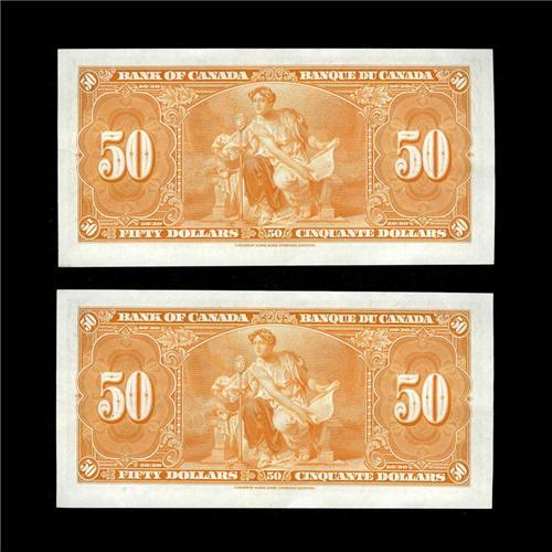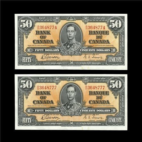 <B>BC-26b $50 1937. Two Examples.</B></I><BR>Brilliant orange ink and a light center fold each is found on this pair that is separated by two serial numbers. Both also have a couple of small spots within the bottom margin. <B>About Uncirculated.</B></I>
