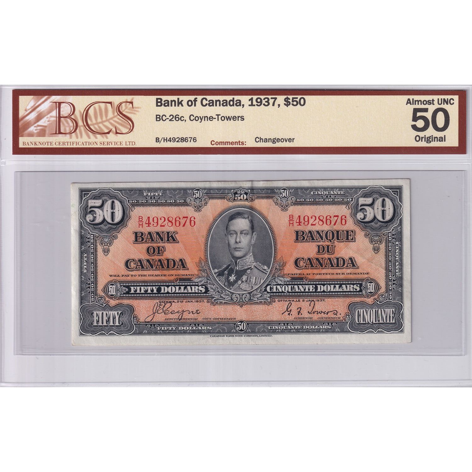 BC-26c 1937 $50 BCS AU50 Original Coyne-Towers, Changeover, SN: B/H4928676