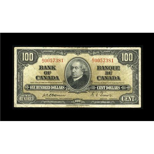 <B>BC-27a $100 1937.</B></I><BR>Top edge tear was the result of this note once being a wallet piece. <B>Very Good-Fine.</B></I><BR><I>From The Halton Lake Collection</B></I>