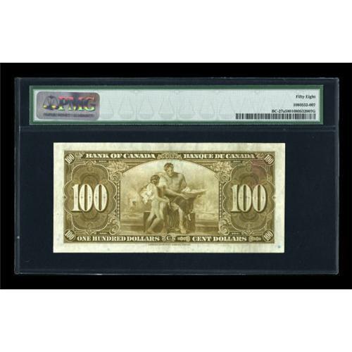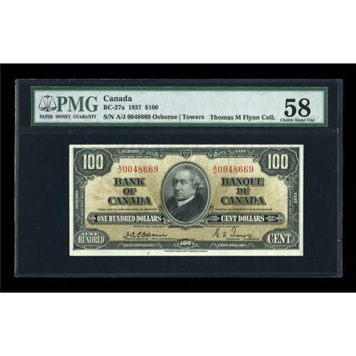 <B>BC-27a $100 1937</B></I><BR> This is the rare signature combination for this denomination, with PMG having catalogued only five examples to date. Two have been circulated pieces, two uncirculated, with this piece right in the middle. PMG <B>Choice About Uncirculated 58.</B></I><BR><I>From The Thomas M. Flynn Collection</B></I><BR><BR><b>Shipping:</b> Coins & Currency (<a target="_blank" href="http://www.heritageauctions.com/common/shipping.php">view shipping information</a>)
