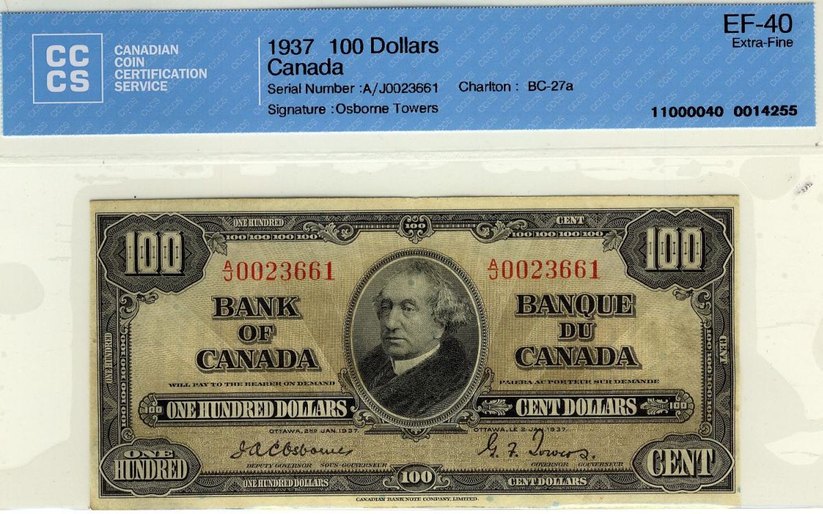 BC-27a 1937 $100 A/J0023661 Osborne-Towers CCCS EF-40. Underrated in book
