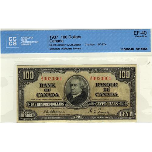 BC-27a 1937 $100 A/J0023661 Osborne-Towers CCCS EF-40. Underrated in book