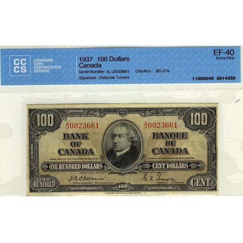 BC-27a 1937 $100 A/J0023661 Osborne-Towers CCCS EF-40. Underrated in book