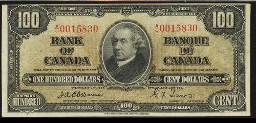 BC-27a 1937 $100 Osborne A/J0015830, EF-AU, small tear. Rare note!