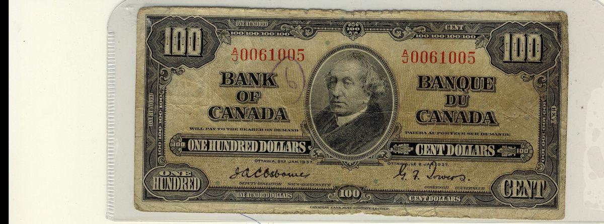 BC-27a 1937 $100 Osborne #AJ0061005, VG with light writing.