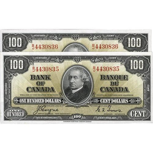 <B>BC-27c $100 1937. Two Consecutive Examples.</B></I><BR>A delightful duo that has been well preserved. <B>Choice Crisp Uncirculated.</B></I><BR><I>From The Halton Lake Collection</B></I>