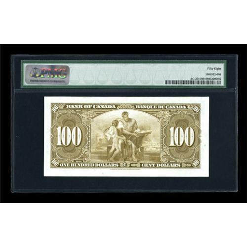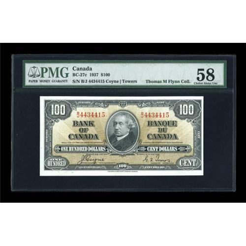 <B>BC-27c $100 1937</B></I><BR> A well printed example which appears New in the PMG holder. PMG <B>Choice About Uncirculated 58.</B></I><BR><I>From The Thomas M. Flynn Collection</B></I><BR><BR><b>Shipping:</b> Coins & Currency (<a target="_blank" href="http://www.heritageauctions.com/common/shipping.php">view shipping information</a>)