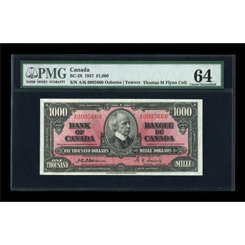 <B>BC-28 $1000 1937</B></I><BR> This denomination, although part of the 1937 series, was not released until January of 1952, having been kept in the reserve stockpile of the Bank of Canada over the years, as indicated by the Osborne-Towers signatures, the only ones employed for this denomination. The color and print quality of this $100 is well nigh perfect, and the PMG assigned grade of <B>Choice Crisp Uncirculated 64 </B></I>appears quite conservative. <BR><I>From The Thomas M. Flynn Collection</B></I><BR><BR><b>Shipping:</b> Coins & Currency (<a target="_blank" href="http://www.heritageauctions.com/common/shipping.php">view shipping information</a>)
