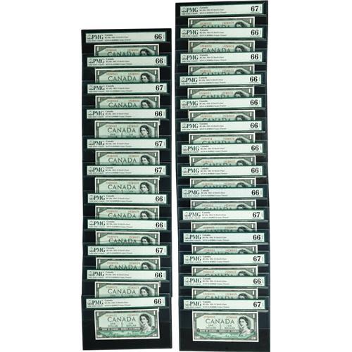 <B>BC-29a $1 1954 Devil's Face Twenty-five Consecutive Examples.</B></I><BR> This is a spectacular run with 17 <B>PMG Gem Uncirculated 66 EPQs </B></I>and eight <B>PMG Superb Gem Unc 67 EPQs.</B></I><BR><BR><b>Shipping:</b> Coins & Currency (<a target="_blank" href="http://www.heritageauctions.com/common/shipping.php">view shipping information</a>)