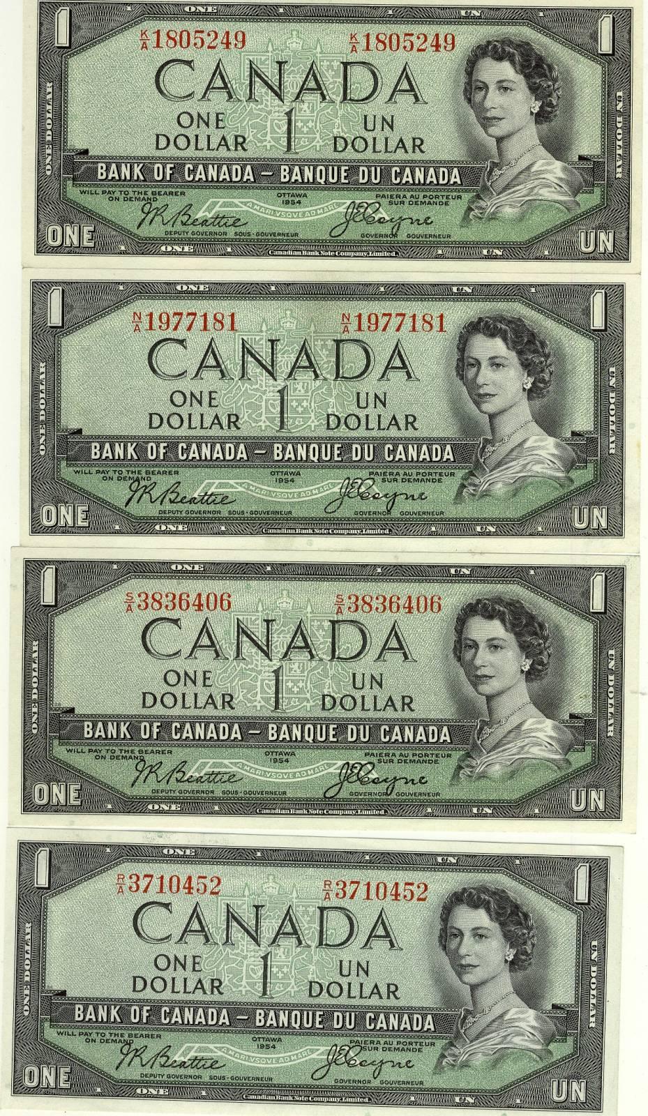 BC-29b 1954 $1 DF. Lot of 4 notes AU to UNC.