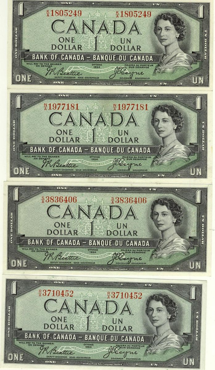 BC-29b 1954 $1 DF. Lot of 4 notes AU to UNC.