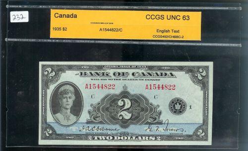 BC-3 1935 $2 A1544822 English text "CCGS graded UNC 63" Original uncirculated. Bright and crip note!