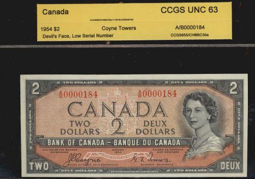 BC-30a 1954 $2 A/B0000184 Devil's face Coyne-Towers "CCGS UNC63" . A nice choice Unc with low serial number.