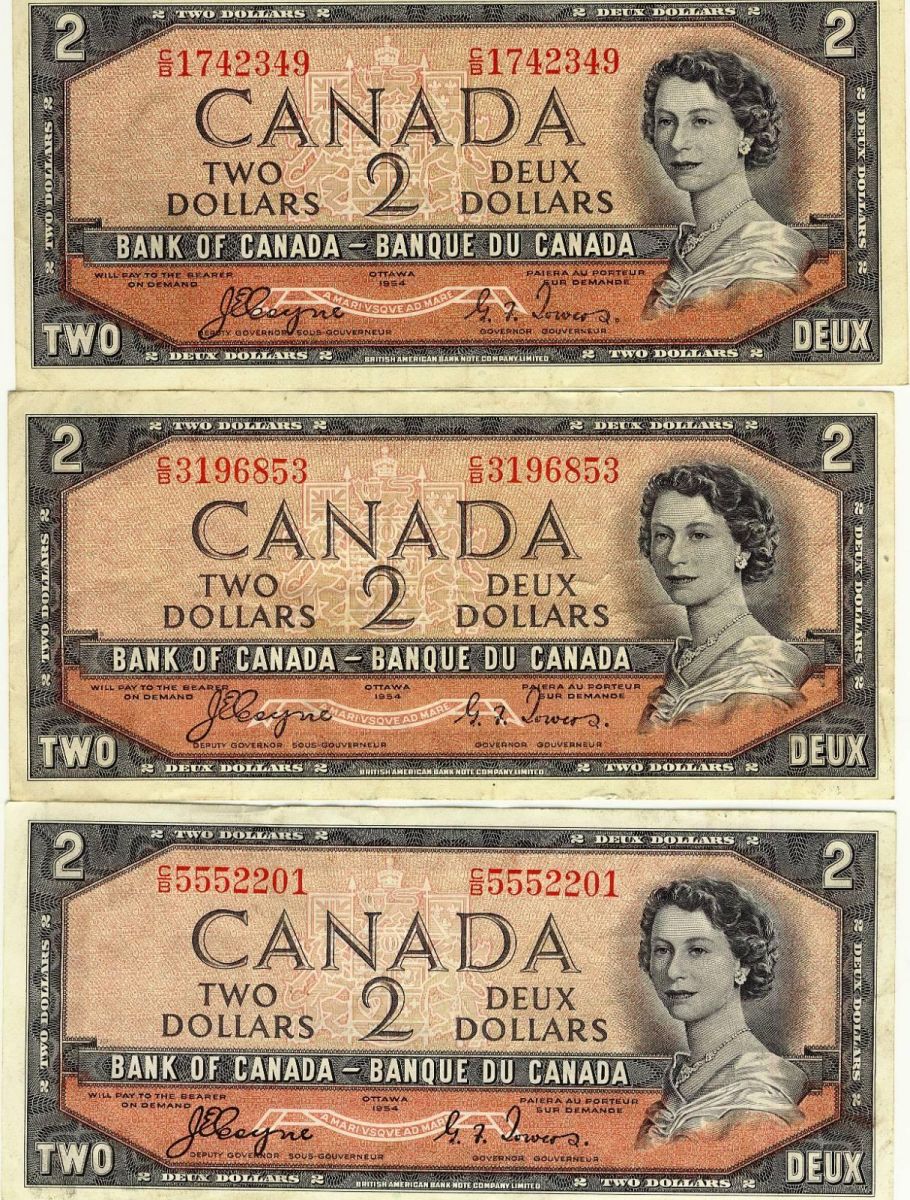 BC-30b 1954 $2 DF. Lot of 3 notes VF to VF+.