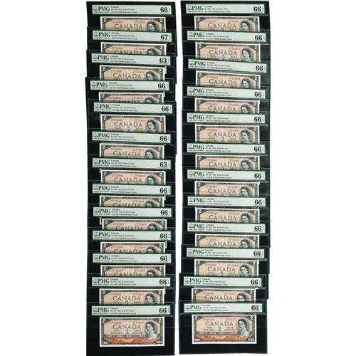 <B>BC-30b $2 1954 Devil's Face Twenty-five Consecutive Examples.</B></I><BR> This better D/B run kicks-off with 22 <B>PMG Gem Uncirculated 66 EPQ </B></I>notes, and they are followed by a single <B>PMG Superb Gem Unc 67 EPQ </B></I>note, and the final two notes are <B>PMG</B></I> <B>Choice Uncirculated 63 EPQ </B></I>notes. In Charlton these list for $600 per note in Gem Uncirculated condition.<BR><BR><BR><b>Shipping:</b> Coins & Currency (<a target="_blank" href="http://www.heritageauctions.com/common/shipping.php">view shipping information</a>)