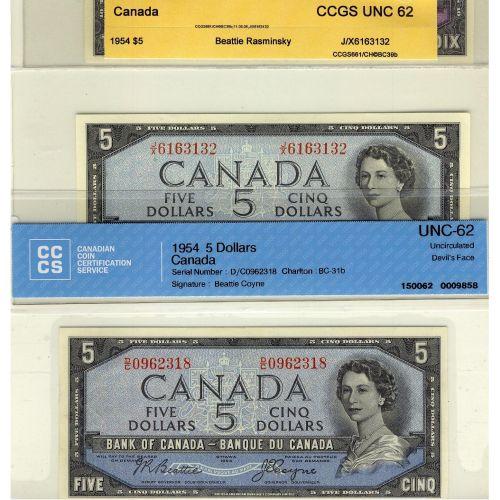 BC-31b 1954 $5, BC-39b $5. Lot of 2 certified notes. BC-31b CCCS UNC62, BC39b CCGS UNC62