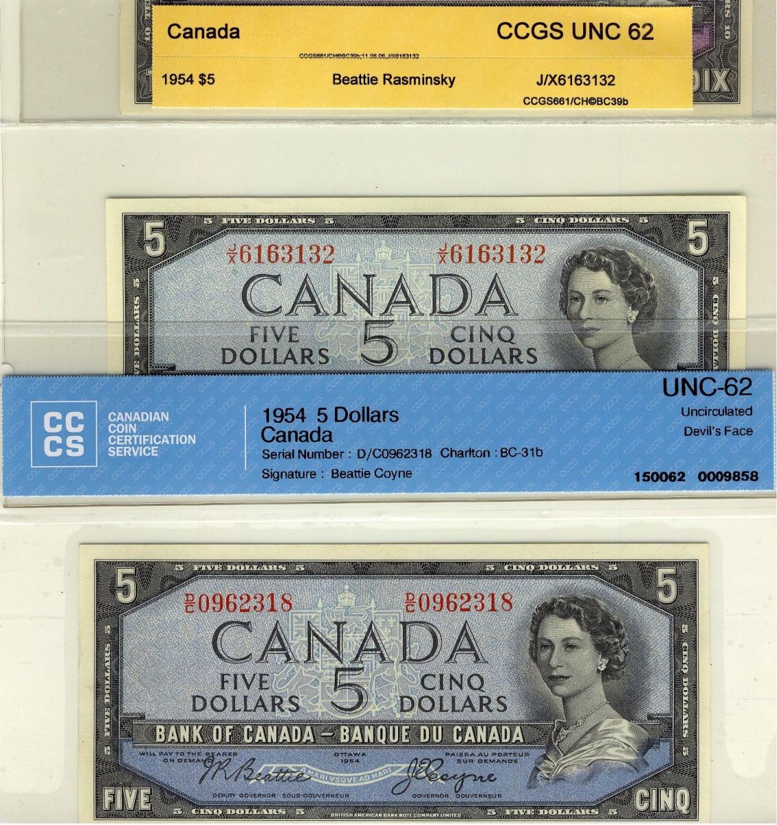 BC-31b 1954 $5, BC-39b $5. Lot of 2 certified notes. BC-31b CCCS UNC62, BC39b CCGS UNC62