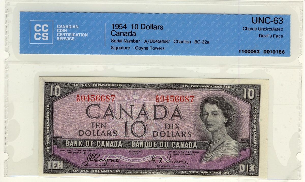 BC-32a 1954 $10 DF #AD0456687. Choice UNC example with full margins.