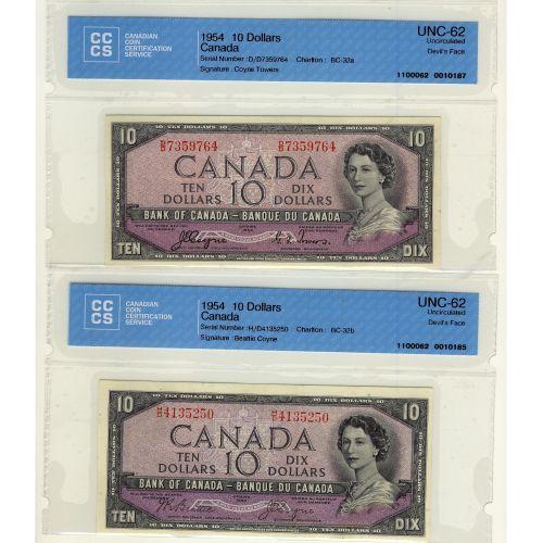 BC-32a and BC-32b 1954 $10 DF #HD4135250, #DD7359764. Lot of 2 notes both CCCS UNC-62