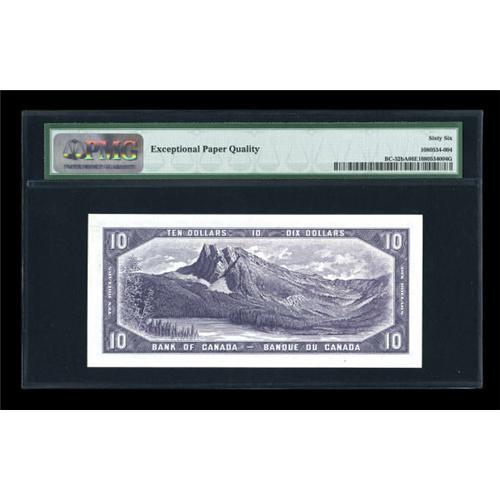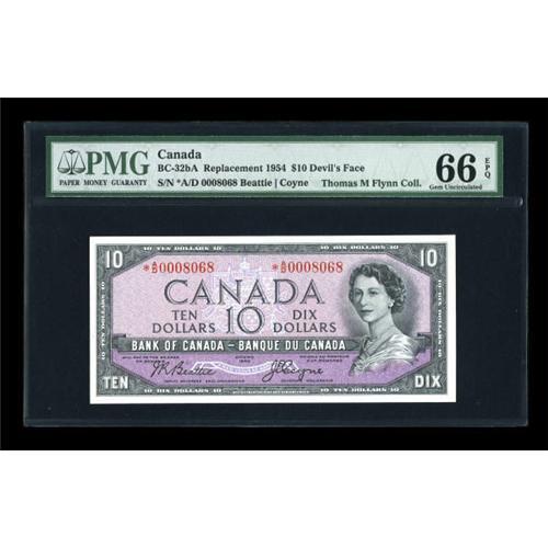 <B>BC-32bA $10 Devil's Face 1954</B></I><BR> Another great replacement note rarity from the Flynn collection. Charlton states that only about 4,800 of these asterisk notes were produced, with survivors few and far between, especially in the highest grade ranges. It's hard to see how many examples could surpass this beautifully original and well centered note, which carries a grade of <B>Gem Uncirculated 66 EPQ </B></I>from PMG. Expect a five figure realization for this rarity before the hammer falls here.<BR><I>From The Thomas M. Flynn Collection</B></I><BR><BR><b>Shipping:</b> Coins & Currency (<a target="_blank" href="http://www.heritageauctions.com/common/shipping.php">view shipping information</a>)