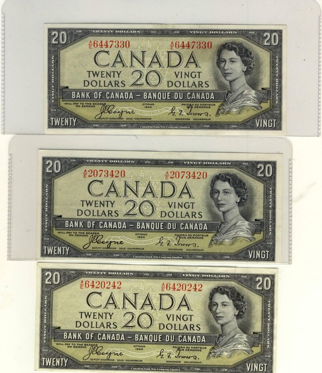 BC-33a 1954 $20 DF. Lot of 3 notes VF to EF.