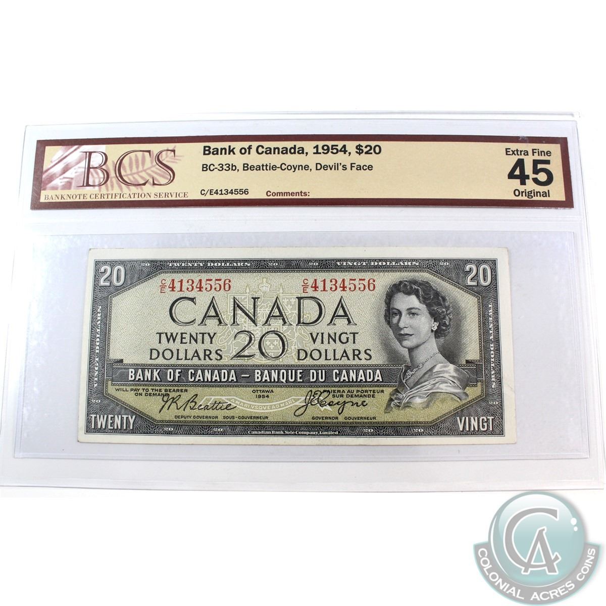 BC-33b. 1954 Bank of Canada $20, Beattie-Coyne Devils face, C/E :4134556, BCS EF-45, Original.