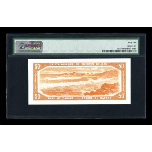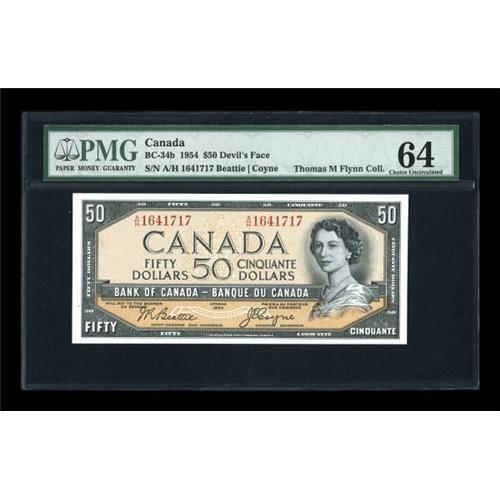 <B>BC-34b $50 Devil's Face 1954</B></I><BR> The BC-34b is considerably the scarcer of the two $50 Devil's Face signature combinations, especially in this state of preservation. This note is perfectly centered on both face and back and appears far superior to its PMG assigned grade of <B>Choice Uncirculated 64. </B></I>Even at that grade, it's nicer than all but one of the eleven examples already graded by PMG.<BR><I>From The Thomas M. Flynn Collection</B></I><BR><BR><b>Shipping:</b> Coins & Currency (<a target="_blank" href="http://www.heritageauctions.com/common/shipping.php">view shipping information</a>)