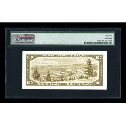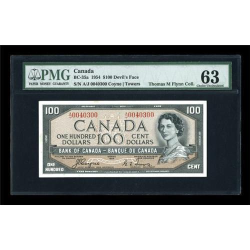 <B>BC-35a $100 Devil's Face 1954</B></I><BR> A bright and nicely centered $100 Devil's Face example. PMG <B>Choice Uncirculated 63.</B></I><BR><I>From The Thomas M. Flynn Collection</B></I><BR><BR><b>Shipping:</b> Coins & Currency (<a target="_blank" href="http://www.heritageauctions.com/common/shipping.php">view shipping information</a>)